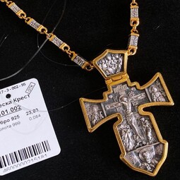 Серебряный крест с позолоченной отделкой в форме якоря с изображением на лицевой стороне Распятия Иисуса Христа. Рядом нанесены инициалы Иисуса Христа и слово НИКА, что является символом победы Господа над смертью и Воскресением. Сбоку от него изображены Пресвятая Богородица и святой Иоанн Креститель, они являются символом защиты человечества перед Господом.