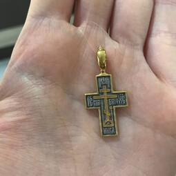 Серебряный нательный крест с Голгофой и молитвой на лицевой стороне и на обороте выполнен в стиле русских старообрядческих крестов. Они распространены среди православных, придерживающихся традиций и обрядов Русской Православной Церкви до середины XVII века.