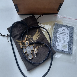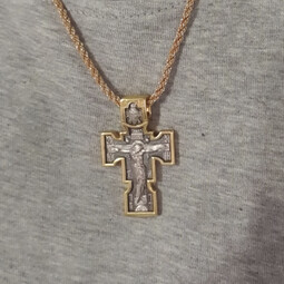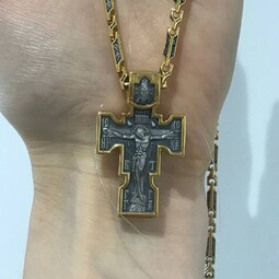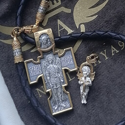Серебряный крест строгой геометрической формы с изящной позолоченной отделкой. На лицевой стороне изображено Распятие Христа на фоне прекрасного города Иерусалима. Рядом нанесены инициалы Иисуса Христа и слово НИКА, что является символом победы Господа над смертью и Воскресением. Сверху над Распятием отображена самая главная святыня всех православных верующих - Спас Нерукотворный. Он почитается как сильнейший защитный образ от злых духов, от темных сил и недобрых намерений других людей.