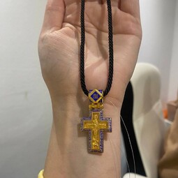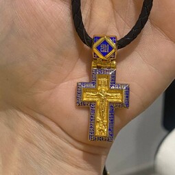 Массивный серебряный крест, выполненный в византийском стиле и украшенный золотом и цветной эмалью. На лицевой стороне изображено Распятие Христа на фоне прекрасного города Иерусалима. Распятие Христово является символом христианства и олицетворяет победу над злом и смертью. Молитва в виде буквенного орнамента, нанесенная в позолоченных рамках, окружает Распятие. На ухе креста расположены надписи «Царь Славы» и «Сын Божий».