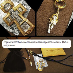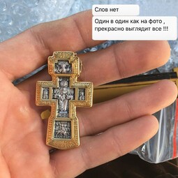 серебряный крест с позолоченной отделкой. По контуру с лицевой стороны написаны