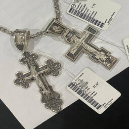 Массивный крест из серебра. На лицевой части в центре изображено Распятие Христово. По бокам от него - склонившиеся в молитве фигуры: Богоматерь и Иоанн Предтечей.