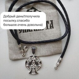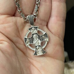 Серебряный крест с изображением лика Иисуса Христа на лицевой стороне. Он представлен как Господь Вседержитель. В одной руке он держит книгу Бытия. Другая рука поднята в молитве.
