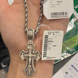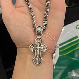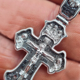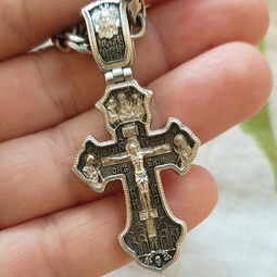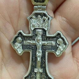 Крестик из серебра с Распятием Христа на передней части. Сбоку от него стоят Пресвятая Богородица и Иоанн Предтеча, склонившие свои головы в прошении. Над Распятием помещена Святая Троица.