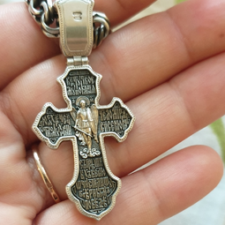 Вокруг Архангела начертаны начальные слова из молитвы Животворящему Кресту - «Кресту Твоему поклоняемся, Христе, честному хранителю мира, спасению нас, грешных, велию очистилищу, верным победе».
