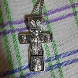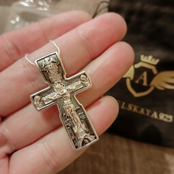 Крест из серебра с Распятием Христа на лицевой части. Сбоку от него стоят Пресвятая Богородица и Иоанн Предтеча, склонившие свои головы в прошении.