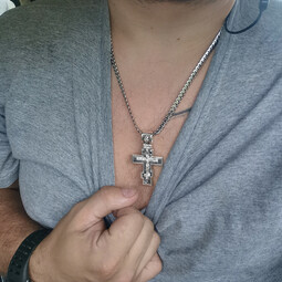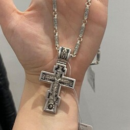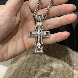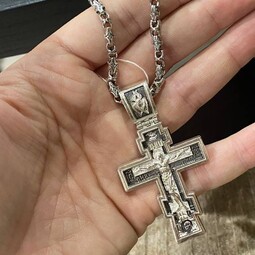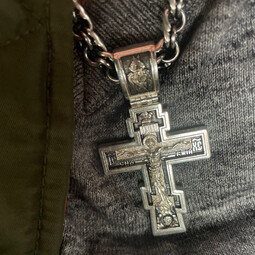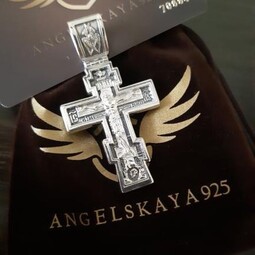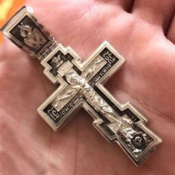 Серебряный крест с изображением Распятия Христова на лицевой стороне и оградительной молитвой на обороте. С этими словами к Богу обращаются в опасных жизненных ситуациях и для защиты от злых духов.