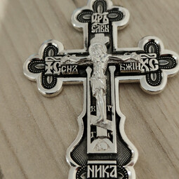 На передней части креста изображено Распятие Иисуса Христа.  Над  ним расположена надпись «Царь Славы». Выше  нарисован шестикрылый серафим. Считается, что они ближе всех находятся к Богу.  У ног Иисуса  написано «Ника». Это означает победу Христа над смертью.