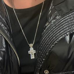 Серебряный крест с изображением Распятия Иисуса Христа. Над Распятием закреплена бусина с Хризмой, которая является древнейшим символом Христа. Она составлена из греческих букв, с которых начинается его имя.