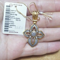 Серебряный православный крест с позолоченным покрытием. В центре его лицевой части изображена Хризма, которая является древнейшим символом Христа. Она составлена из греческих букв, с которых начинается его имя.
