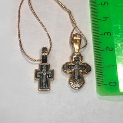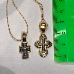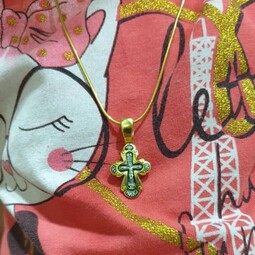 Серебряный крест округлой формы, которая напоминает собой распустившийся цветок, что является символом того, что Крест-это не только боль и страдания, но жизнь, ведь Христос победил смерть. На лицевой стороне креста изображено Распятие Иисуса. Оно нанесено на затемненный фон, чтобы усилить духовную значимость этой библейской сцены.