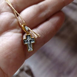 На лицевой стороне крестика из серебра 925 пробы с позолотой изображено Распятие. На обороте - Казанская икона Богородицы. Это один из самых почитаемых образов. Молитва ему способна помочь в печали или унынии, при заболеваниях, как физических, так и духовных. Её ставили возле детских кроваток, что бы оградить детей от болезней, зла, сглазов и прочего.