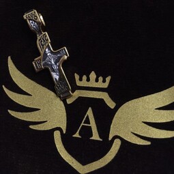 Серебряный крест геометрической формы, на лицевой стороне которого, на затемненном фоне традиционно изображено Распятие Иисуса. Над ним расположена надпись «Царь Славы». С двух сторон от Иисуса написано «Ника». Это означает победу Христа над смертью. На обороте —  слова-обращения к Богу.