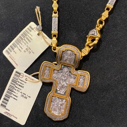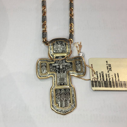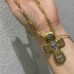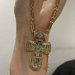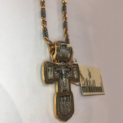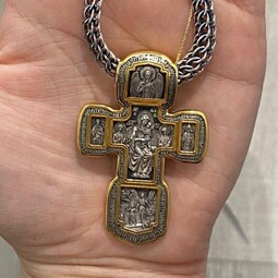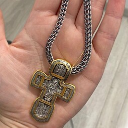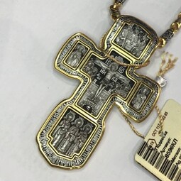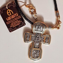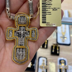 Серебряный крест с изображением в центральной части Распятия Христова и тех Святых, которые были рядом с Ним в тот момент. Возле Распятого Иисуса-самые значимые для верующих иконы: Святая Троица, Три Спасителя Вселенских. По бокам, на горизонтальной планке - иконы Святого Николая и Мученика Трифона. По контуру ювелирное изделие огибают слова-обращения к Богу и тонкий позолоченный кант.