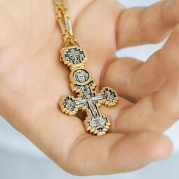Над Распятием Иисуса Христа на этом нательном крестике из серебра помещена икона Пресвятой Троицы, образ Триединого Бога, явившегося в виде трех Ангелов Аврааму. Они сидят за трапезным столом вокруг чаши, символизирущей грядущую жертву Иисуса Христа.
