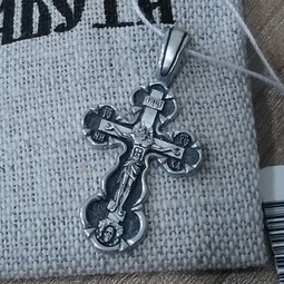 Изящный серебряный крест с изображение Распятия Иисуса на лицевой стороне. На обратной стороне - образ Пресвятой Покровской Богородицы. Ее почитают как защитницу, у нее просят покровительства в сложных жизненных ситуациях.