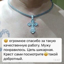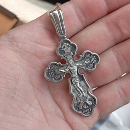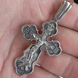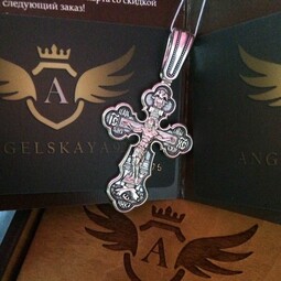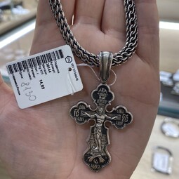 Изящный серебряный крест с изображение Распятия Иисуса на лицевой стороне.