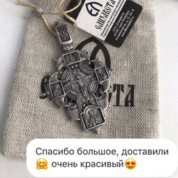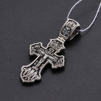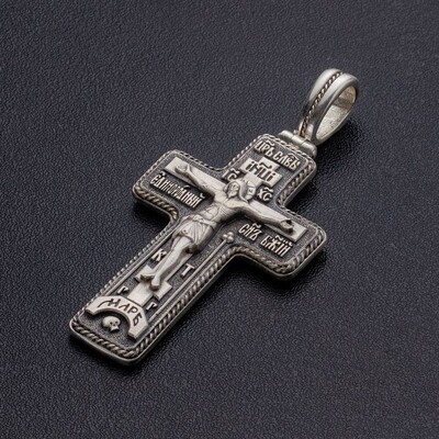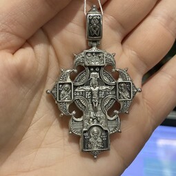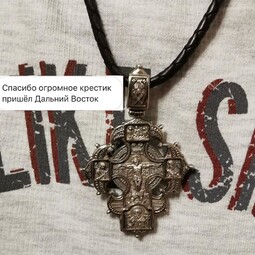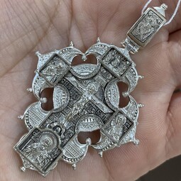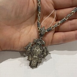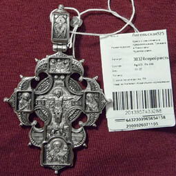Серебряный крест необычной формы, на лицевой части которого, в центре изображено Распятие Христово. По бокам от него - склонившиеся в молитве фигуры: Богоматерь и Иоанн Предтечей. В верхней части креста нарисована Святая Троица. Внизу - образ Николая Чудотворца. Его почитают как защитника путешественников в долгой дороге, просят у него исцеления от болезней и помощи в семейных делах.