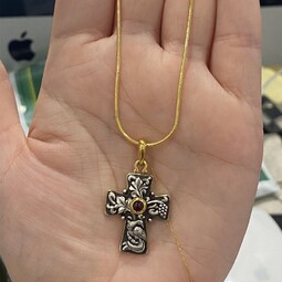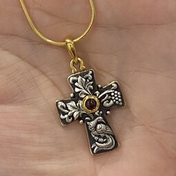 Серебряный крест с позолотой и изящной отделкой рельефным узором на лицевой стороне. Он выполнен в виде виноградной лозы и птиц, которые являются издревле божественными знаками. Лоза - символ Иисуса, который приходит к нам через Причастие. Птицы отождествляются с миром и благочестием.