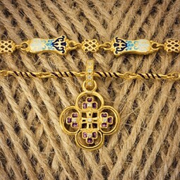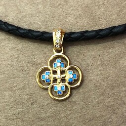 Изящный позолоченный крест в форме четырехлистного клевера, который является символом рая. Внутри каждого лепестка: трехлистный клевер, украшенный фианитом. Такой цветок - знак Святой Троицы: Отца, Сына и Святого Духа.