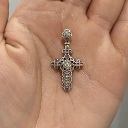 Православный крест с эмалевой отделкой, которая образует орнамент, напоминающий цветы лилии с переплетенными лентами. Цветок символизирует чистоту, целомудрие и благочестие. Это придает изящность форме и делает изделие ярким. Орнамент продолжается на ушке креста с лицевой стороны. Нательная сторона креста украшена таким же образом.