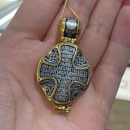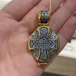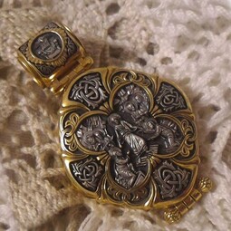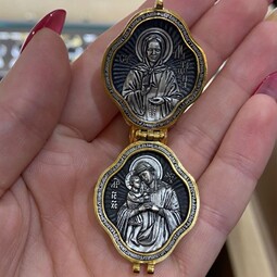 Серебряный мощевик с изящной позолоченной отделкой. На лицевой стороне- Голгофский крест. Символ веры, символ ее принятия, боли и одновременно бесконечной любви ко всему живому. На нем был распят Иисус Христос. На обратной стороне ювелирного изделия начертаны слова-обращения к Пресвятой Богородице.