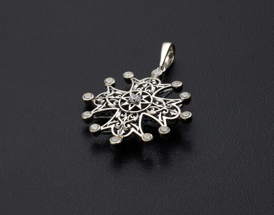 Православная подвеска из серебра 925 пробы с фианитами выполнена в виде звезды.