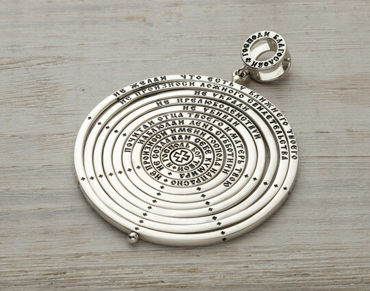 На этой подвеске из серебра 925 пробы на каждом круге размещено по одной заповеди. Это основа христианского вероучения, Закон Божий. Соблюдение их - путь в Царствие Небесное. В комплекте с подвеской идет шнурок длиной до 80 см. Длину можно регулировать с помощью двух узелков.