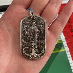 Серебряный жетон с изображением Николая Чудотворца, словно восставшего из морской пучины. Такой образ для Святого выбран не случайно, потому что согласно древним писаниям, Николай Чудотворец не раз приходил на помощь морякам, которые попадали в шторм или сбивались с пути. Поэтому Его почитают как покровителя и помощника военных, моряков и всех тех, кто нуждается в поддержке. Якорь в ногах Святого символизирует надежду на спасение.