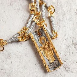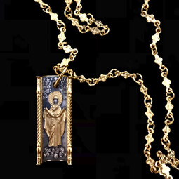 На образке из серебра арочной формы помещена икона "Покров Пресвятой Богородицы". На ней Божья Матерь идет по облакам к Спасителю. В ее руках - покрывало, покров, которым она защищает людей от невзгод и несчастий.