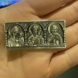 В центральной части размещен образ Спас Вседержитель (Пантократор). Справа от Спасителя образ Казанской иконы Божией Матери, помощницы во всех житейских делах, утешительница и заступница. Слева – образ Николая Чудотворца, покровителя и защитника тех, кто находится в дороге.