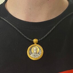 Круглый серебряный образок с позолоченными элементами и изображением Николая Чудотворца на лицевой стороне. Николай Святой почитается в православной церкви, потому что он постоянно исцелял больных, помогал нуждающимся в сложных ситуациях, спасал путешественников от природных невзгод.