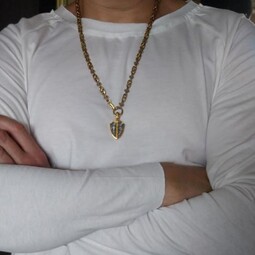 Необычный серебряный образок в виде щита, разделенного на две части позолоченный мечом, который украшен узором. На одну из сторон нанесено изображение Александра Невского, на другую - Святого Георгия. Их почитают как заступников за веру, за воинов и за простых людей. Также их возвели в ранг святых воинов. Поэтому на мече можно увидеть слова, с которыми военные чаще всего обращались к Богу.