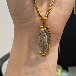 Образок из серебра с позолоченными элементами. Он состоит из фигуры Николая Святого, стоящего в лодке с парусом. Николай - один из самых почитаемых святых с древних времен. У него просят помощи в пути, в сложных жизненных ситуациях, при исцелении болезней. Образ Николая Святого почитается в православной церкви, потому что он постоянно исцелял больных, помогал нуждающимся в сложных ситуациях.