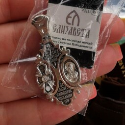 Серебряный кулон с резным православным крестом с инициалами Христа и иконой, на которой изображена Владимирская Божья Матерь. Этим украшена лицевая часть образка. На обратной стороне расположен образ Николая Чудотворца и хризма, которая нанесена на крест. Хризма -монограмма Христа и его древнейший символ.