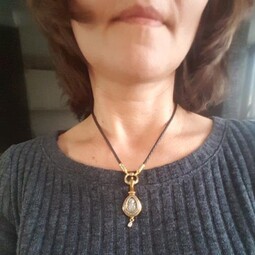 Этот серебряный образок и с позолоченными элементами и с иконой Божией Матери Умягчение злых сердец на лицевой части, а Николаем - Чудотворцем на обратной стороне. Богоматерь изображена с сердцем, проткнутым семью мечами. Это символизирует боль и горе Богородицы в земной жизни, поэтому верующие просят перед этим образом избавления от недобрых мыслей, от осуждения ближних, умягчения сердца своего и защиты от злых людей.