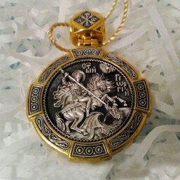 Круглый образок с позолотой с изображением Святого Георгия во время свершения его знаменитого подвига: спасение принцессы от змея. Притом, считается, что принцесса символизирует душу человека, а змей - дьявола-искусителя. Победа Георгия означает то, что душа спасена от гибели. Святой Георгий очень почитается в Христианской Церкви, потому что он защищает воинов и помогает трудящимся.