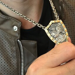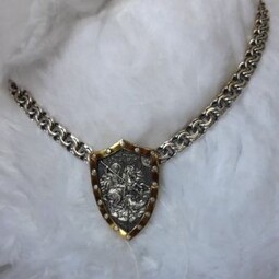 Серебряный образок в виде позолоченного щита с изображением Святого Георгия во время свершения его знаменитого подвигаспасение принцессы от змеяПритомсчитаетсячто принцесса символизирует душу человекаа змей - дьявола-искусителяПобеда Георгия означает точто душа спасена от гибелиСвятой Георгий очень почитается в Христианской Церквипотому что он защищает воинов и помогает трудящимся