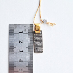 Лаконичная подвеска выполнена в виде пластины с текстом молитвы.  Её текст выделяется при помощи чернения фона, композицию завершает ушко, покрытое позолотой. Это символ высшего значения этих слов.