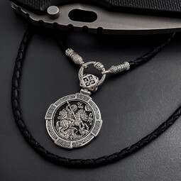 Круглый образок с изображением Святого Георгия во время свершения его знаменитого подвига: спасение принцессы от змея. Притом, считается, что принцесса символизирует душу человека, а змей - дьявола-искусителя. Победа Георгия означает то, что душа спасена от гибели.