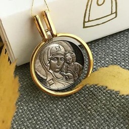 Круглый образок с иконой Божией Матери Казанской в центре и с позолоченной окантовкой. Обратную сторону образка украшает молитва: "Спаси всех молитвами Твоими, Дево Богородице, к Тебе притекающих и избави всякия нужды и скорби".