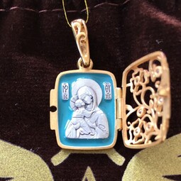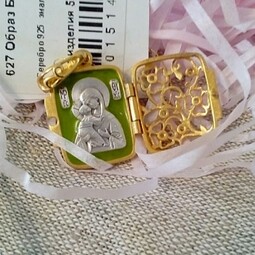Квадратный позолоченный образок с окладом в виде лозы, украшенной фианитами (6 штук). Окладом прикрыта икона Божией Матери Владимирской, которая изображена на темно-зеленом фоне. Зеленый цвет символизирует жизнь. Кроме того, считается, что оклад символизирует таинственность Небесного мира, которая может открыться нам только в том случае, если мы будем усердно молиться.