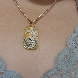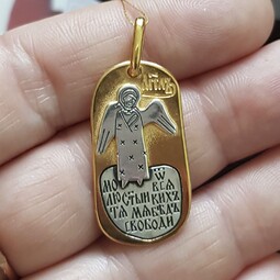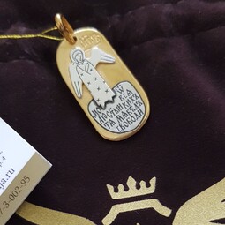 Милое, по-детски наивное изображение Ангела-Хранителя закреплено на позолоченной продолговатой пластине. Ангел появляется рядом с каждым человеком после Крещения. Он его охраняет, наставляет и направляет. Защищает его душу от злых духов и тяжких грехов. Внизу набита молитва, с которой к нему чаще всего обращаются. Оборотная сторона украшена мелкими резными звездочками.