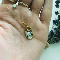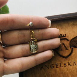 Окантовка и обратная сторона этого образка позолочены. На обратную сторону нанесены буквы. В  целом подвеска выглядит очень тонко, изящно и подходит для молодых девушек, женщин.