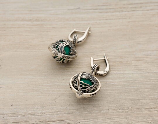 Православные серьги из серебра 925 пробы с малахитом. Изделие выполнено в виде «древа мира». Речь идет о Мамврийском дубе, произрастающем близ города Хеврон в Израиле. Как повествует Библия, к Аврааму пришли три необычных странника. Авраам понял, что перед ним не просто люди, а ему явился сам Бог. Праотец оказал гостям самое большое гостеприимство, накрыв обед под ветвями дуба. За этот поступок, а также за многочисленные добродетели, Бог наградил Авраама, послав ему долгожданного наследника.