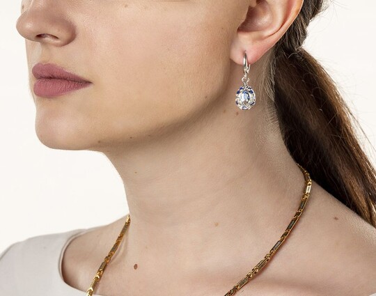 Серебряные серьги с пустотелыми подвесками в виде пасхальных яиц. Подвески имеют резную поверхность и украшены эмалевой росписью с изображением пары лебедей, парящей в небе. Лебеди- символ вечной любви и верности.