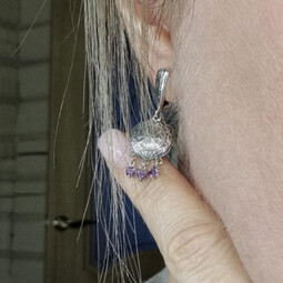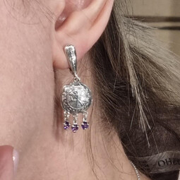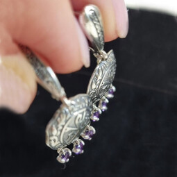 Серьги выполнены из серебра 925 пробы, в нижней части размещены подвески с аметистами.