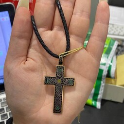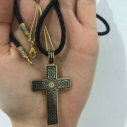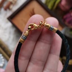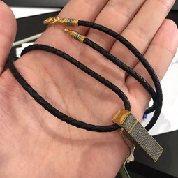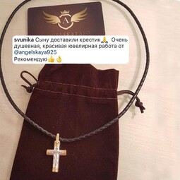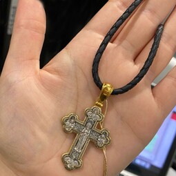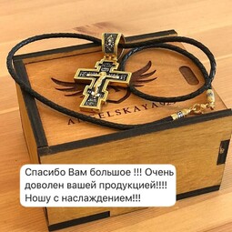 На его концах - специальные серебряные с позолотой зажимы в форме куполов. На них написаны слова – обращения к Богу. Замком служит несъемный позолоченный карабин. Концевик с другой стороны шнурка можно снять самостоятельно для того, что бы повесить какое - то украшение или укоротить его, при необходимости.